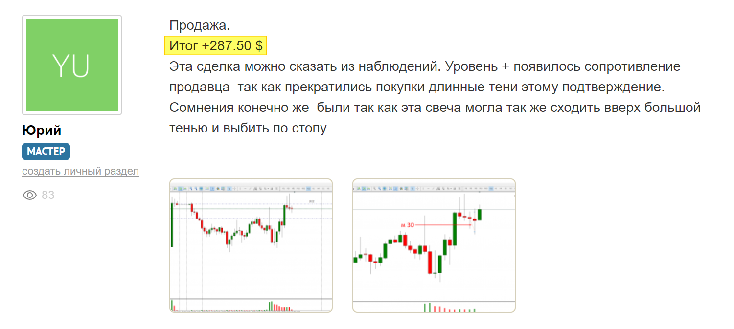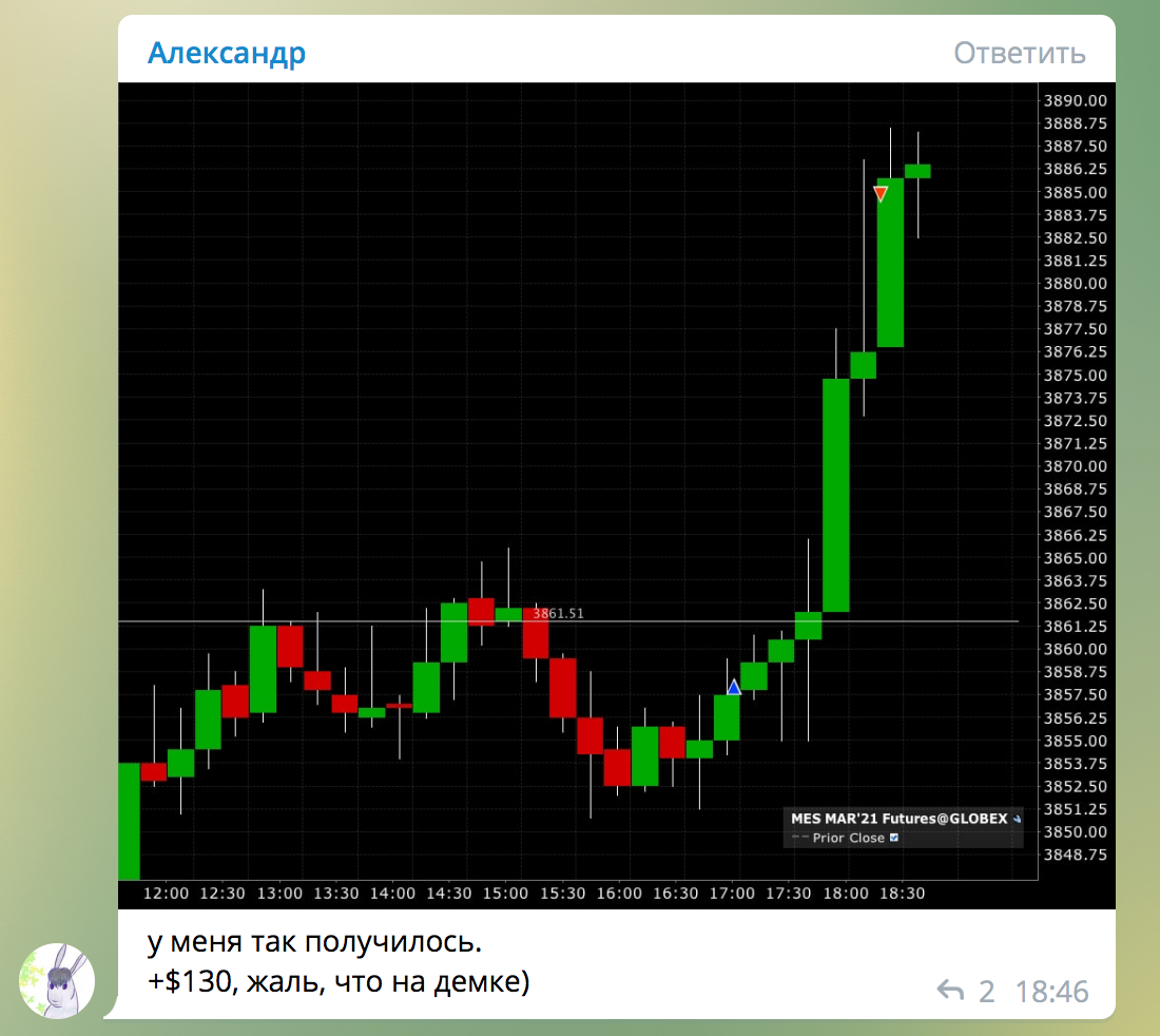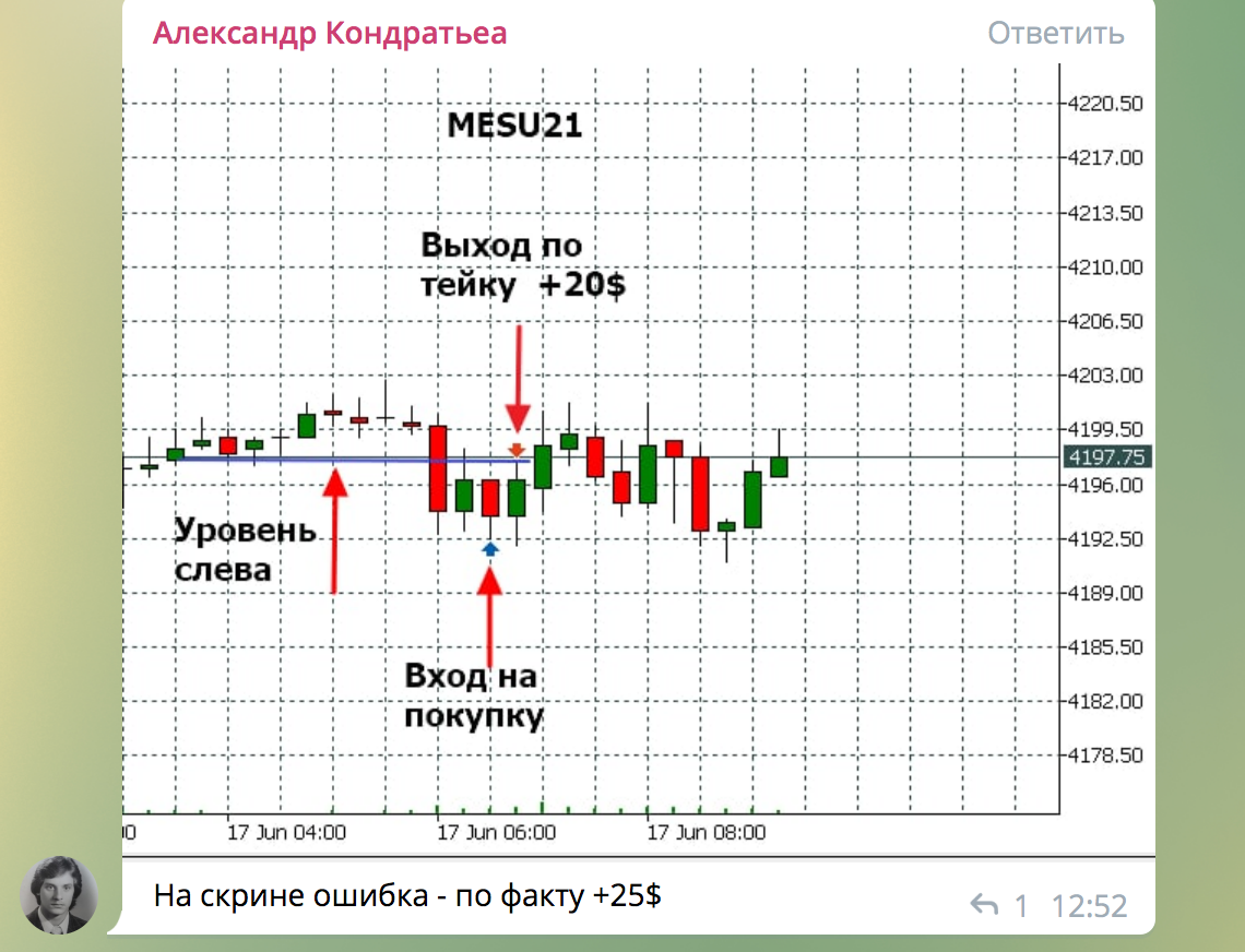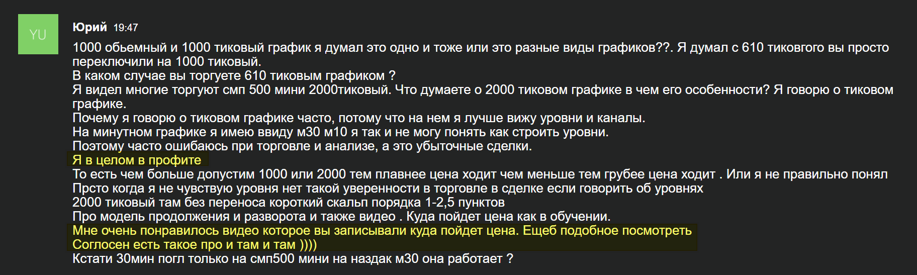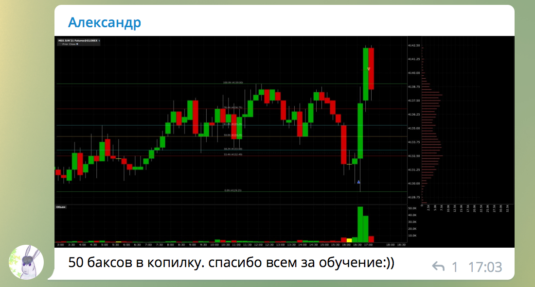 На занятиях мы не просто разбираем историю или абстрактные случаи, а делаем практику «здесь и сейчас». Мы работаем с конкретным фьючерсом, в точное время, анализируем то, что есть на графике и принимаем решение купить или продать. При этом учитываем контекст ситуации, важные события, отчеты, новости и т.д. — все те, особенности, которые нужны для принятия решения и повышают благоприятный исход сделки.