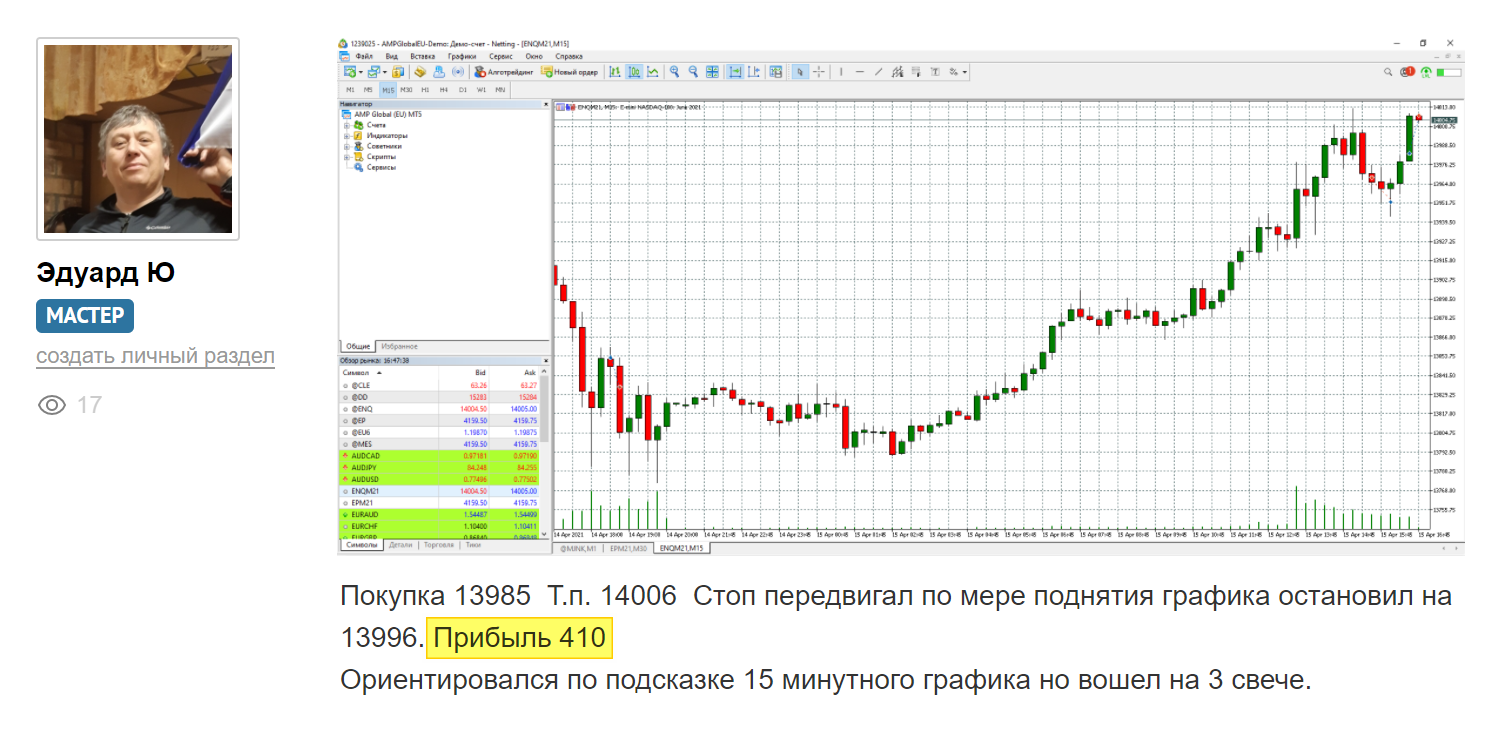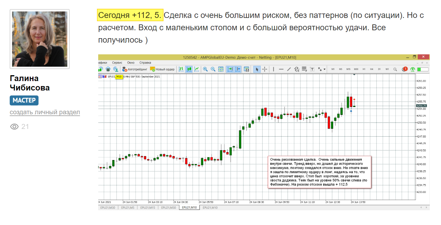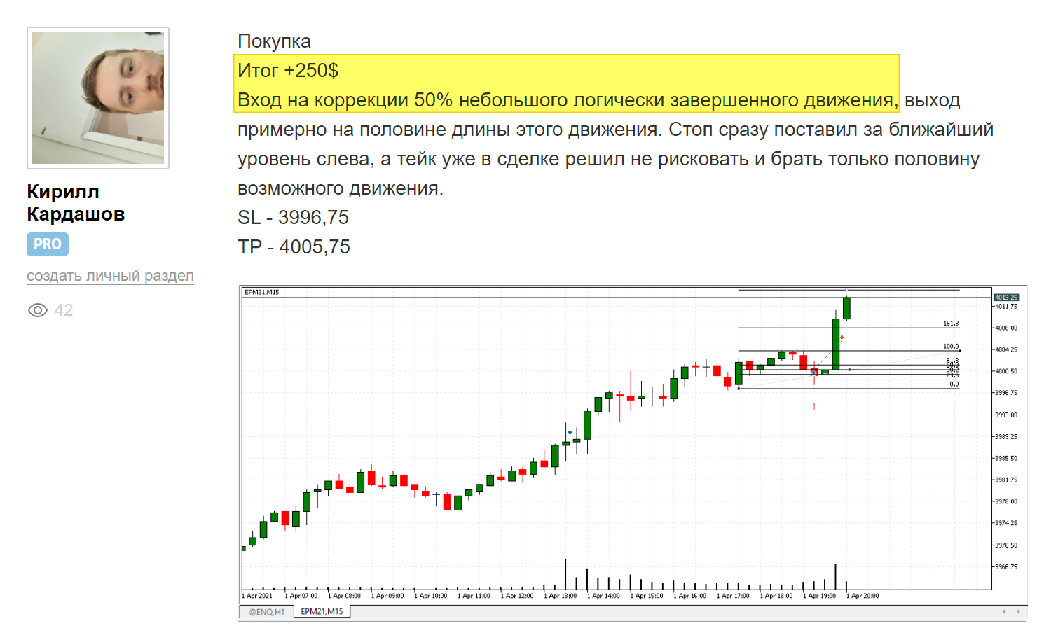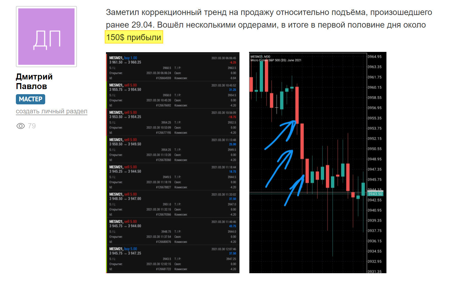 На занятиях мы не просто разбираем историю или абстрактные случаи, а делаем практику «здесь и сейчас». Мы работаем с конкретным фьючерсом, в точное время, анализируем то, что есть на графике и принимаем решение купить или продать. При этом учитываем контекст ситуации, важные события, отчеты, новости и т.д. — все те, особенности, которые нужны для принятия решения и повышают благоприятный исход сделки.